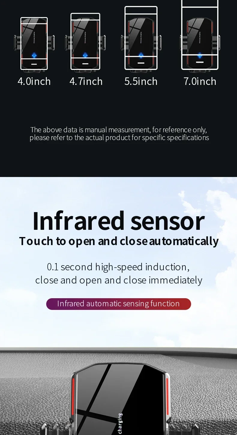 [Grampos automáticos e operação com uma mão] - Este carregador sem fio para carro está equipado com tecnologia de detecção automática.Dois clipes do suporte fecharão e prenderão automaticamente seu telefone quando ele estiver preso ao suporte para carro; Para liberar o telefone, toque com a mão na parte superior do suporte, os clipes serão abertos automaticamente e você poderá retirar o telefone.